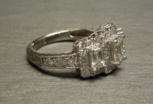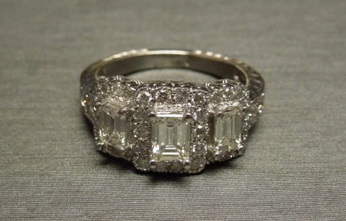 Estate Emerald cut Diamond Three Stone 2.64TCW Engagement Ring 14KT White Gold