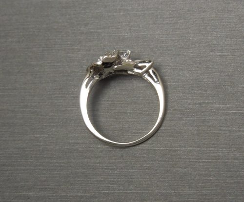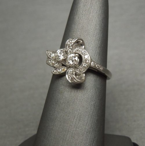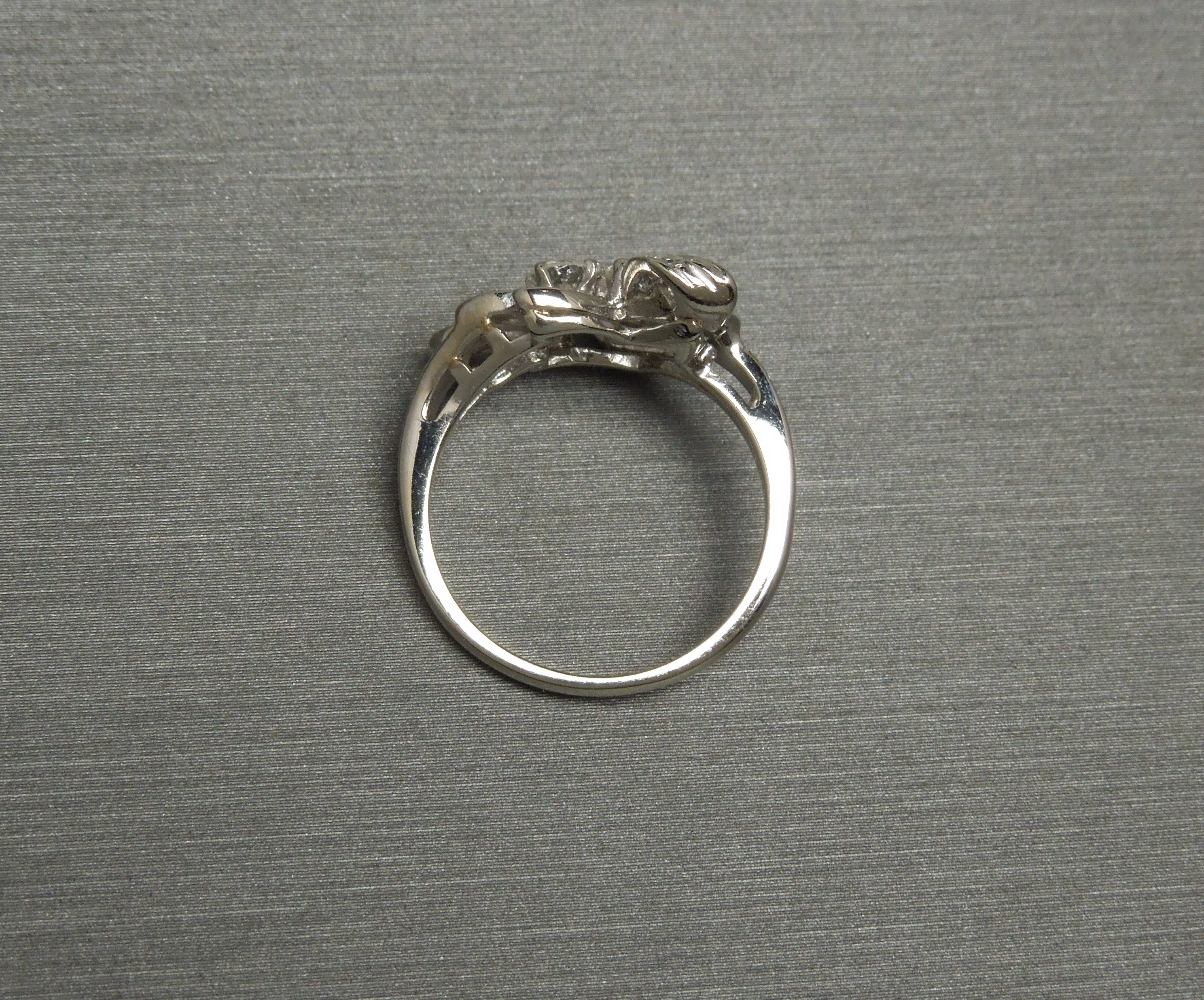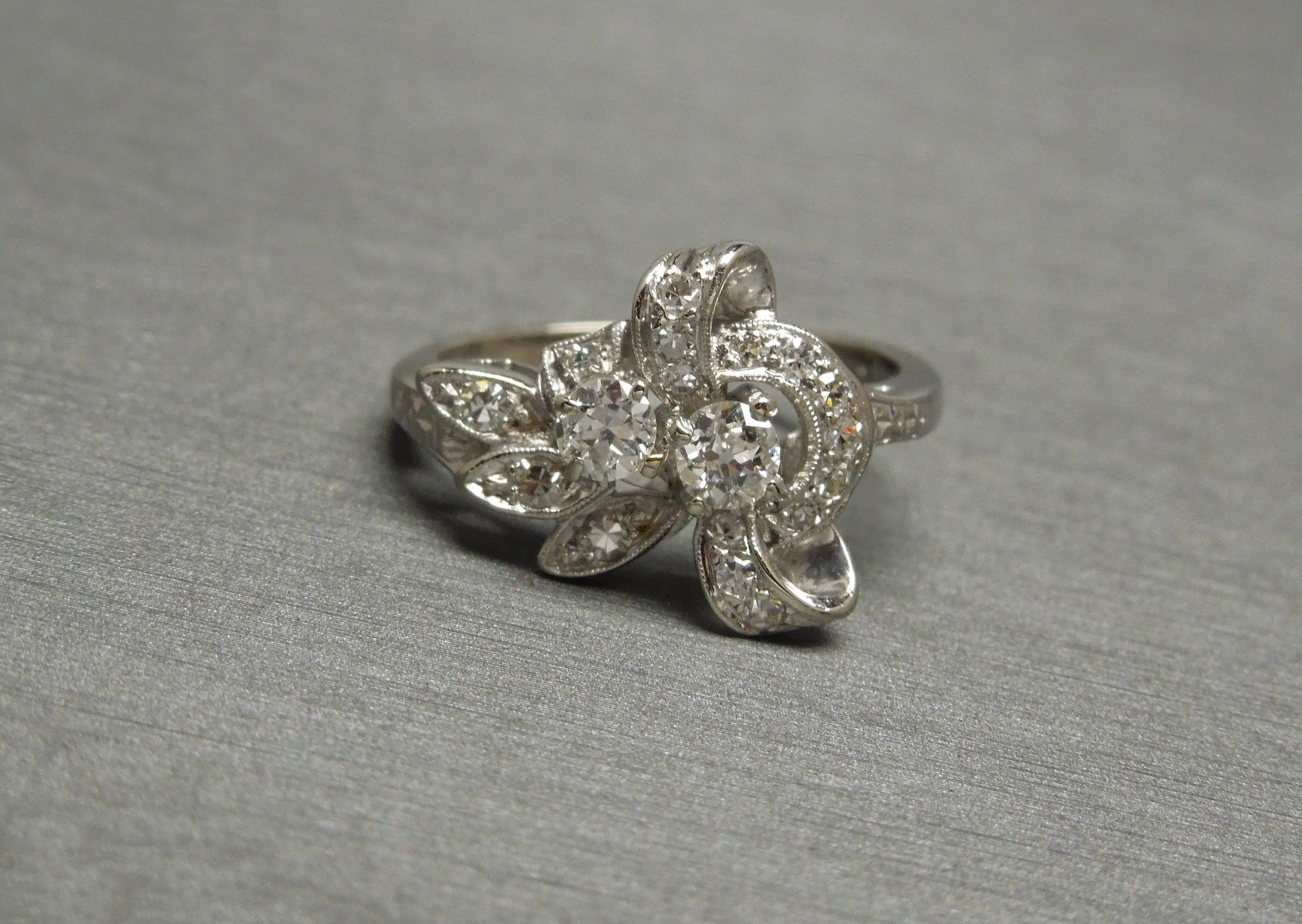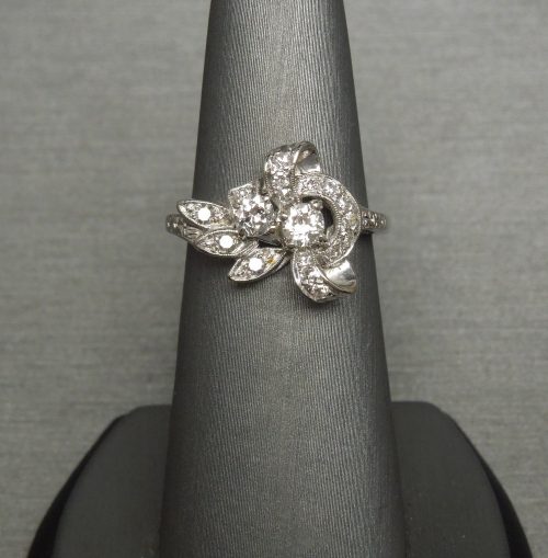 14K White Gold Mine cut Double Diamond Bow Floral Spray Bouquet Ring C1940