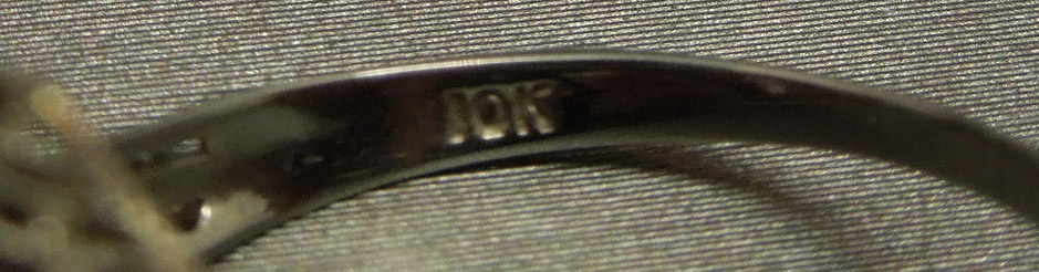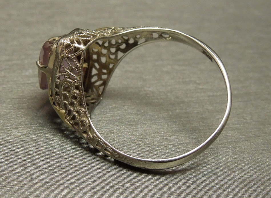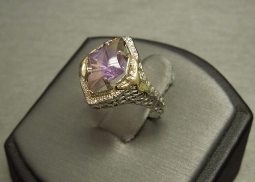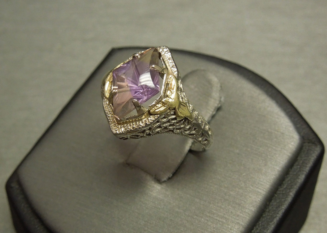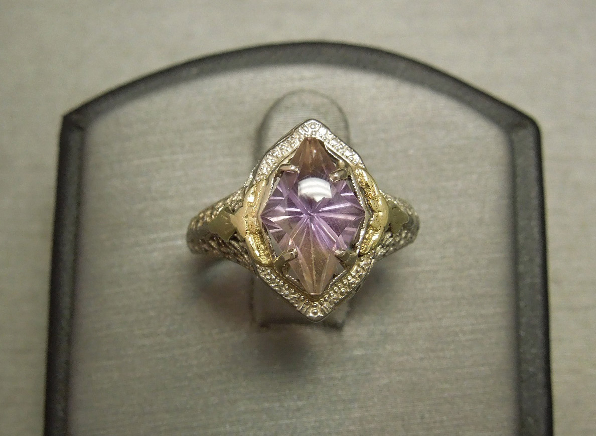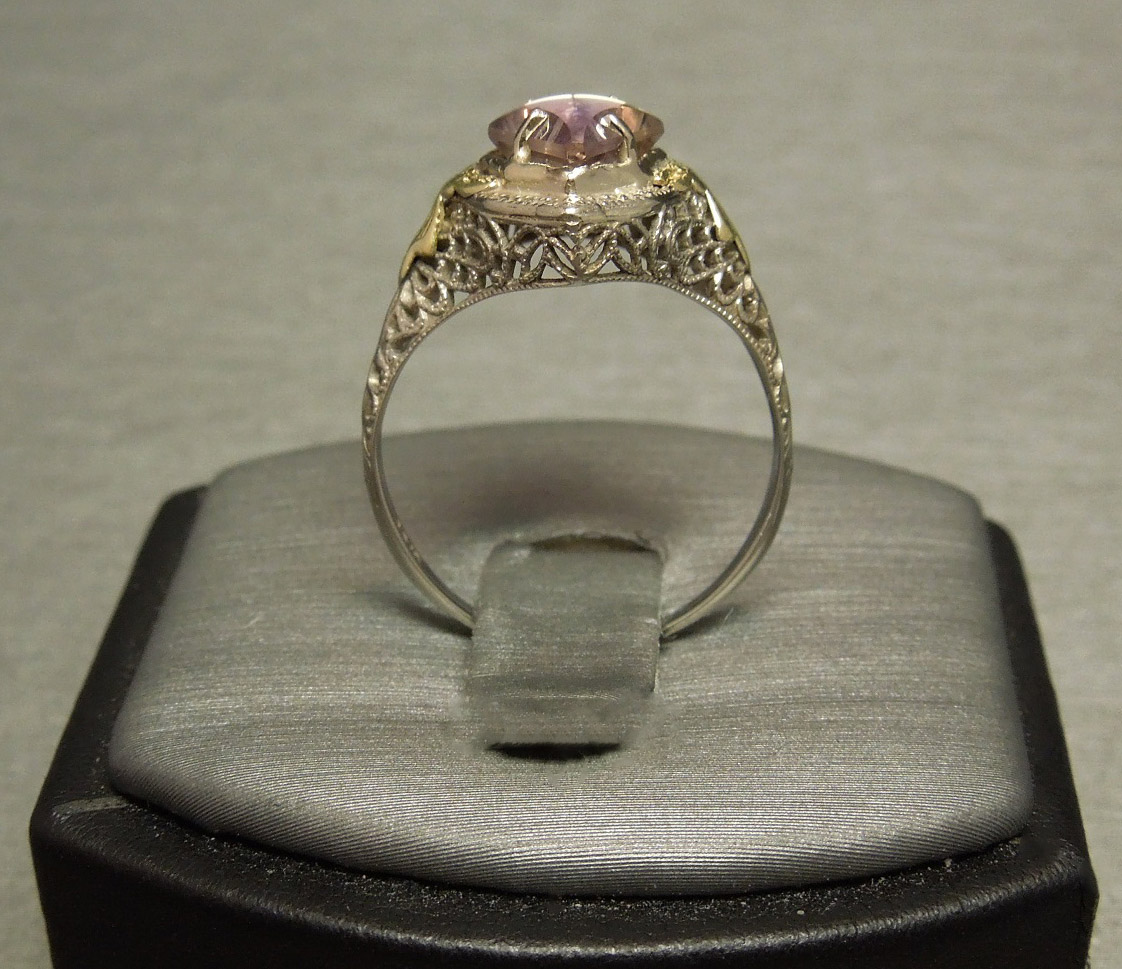 Art Deco 10KT White Gold Filigree Amethyst 5ct Diamond cut Solitaire Engagement Ring w/ Green Gold Accents C1920